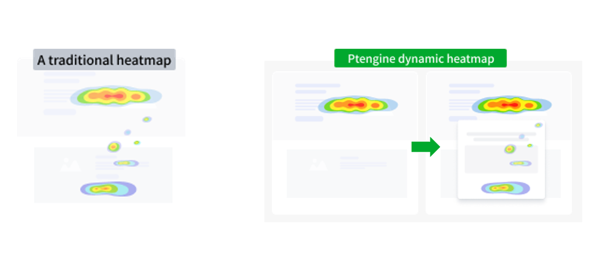 ダイナミックヒートマップは、Ptengine独自の高度な描画技術を用いて作成されるヒートマップです。 他社のスクリーンショット型ヒートマップと異なり、静的にページを取得して描写する方式ではなく、より高度な描画技術と大量のデータを活用しています。 この技術により、訪問者のクリックやタップなどの閲覧行動を高精度に捉え、より深い顧客理解を実現します。