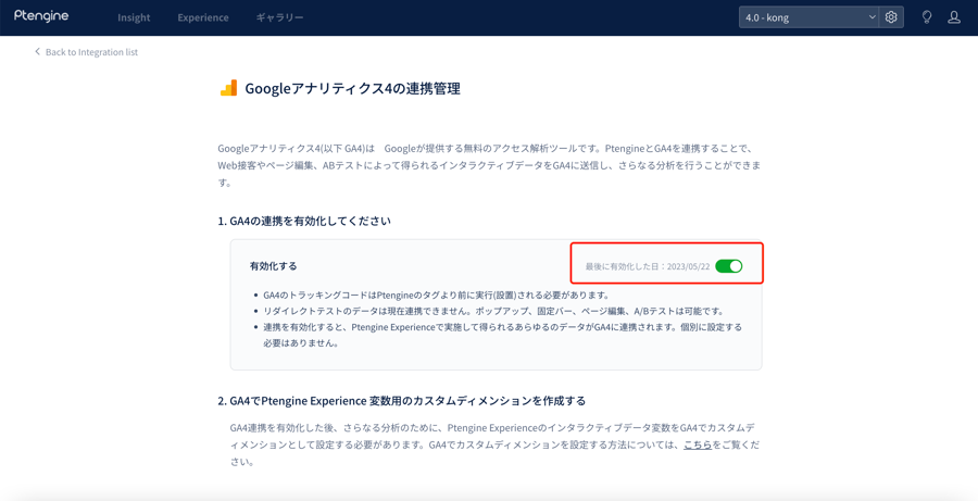 GA4の統合を有効化するには、以下の手順を実行してください: