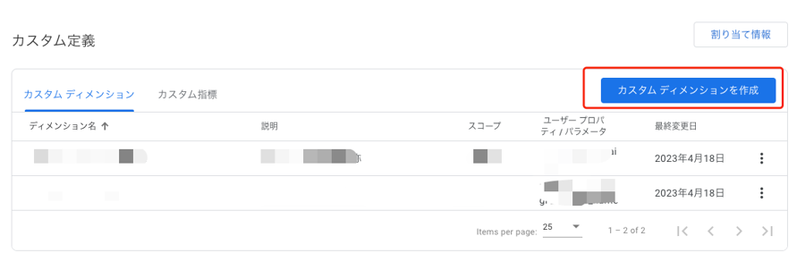 左側のメインメニューパネルから、[管理] → [カスタム定義] → [カスタムディメンションを作成]に移動します。操作画面は以下のようになります: