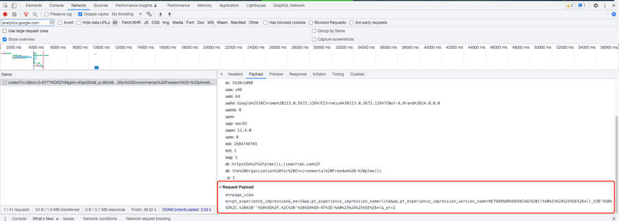 「Network」タブを選択し、「analytics.google.com」を検索して、GA4 のネットワークリクエストをフィルタリングします。