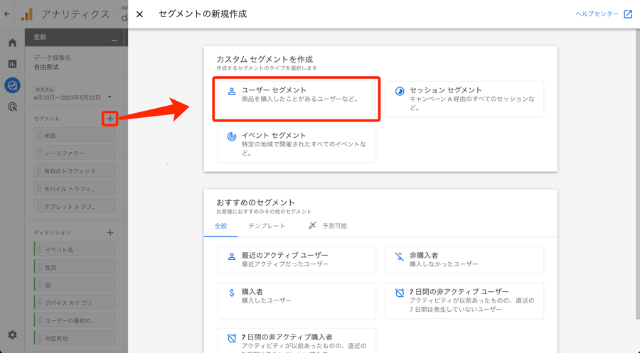 左側の「変数」パネルで、「セグメント」の隣にあるプラスアイコンをクリックします。 「セグメントの新規作成」ページで、「ユーザーセグメント」をクリックします。