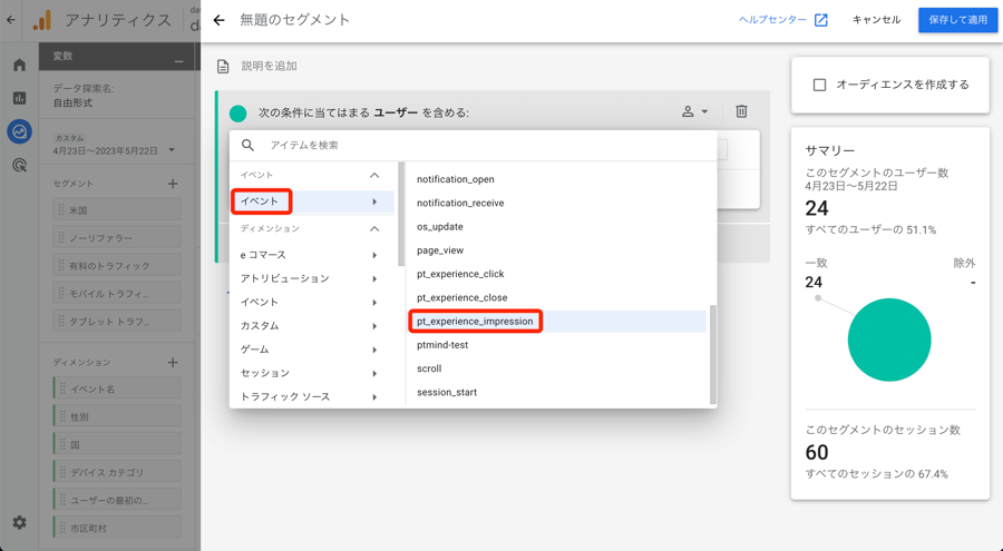 「説明を追加」のドロップダウンリストを展開し、「イベント」をクリックし、「pt_experience_impression」または「pt_experience_click」を選択します(作成したいセグメントに応じて異なります)。