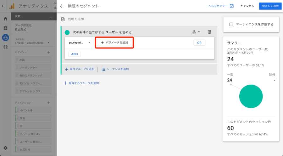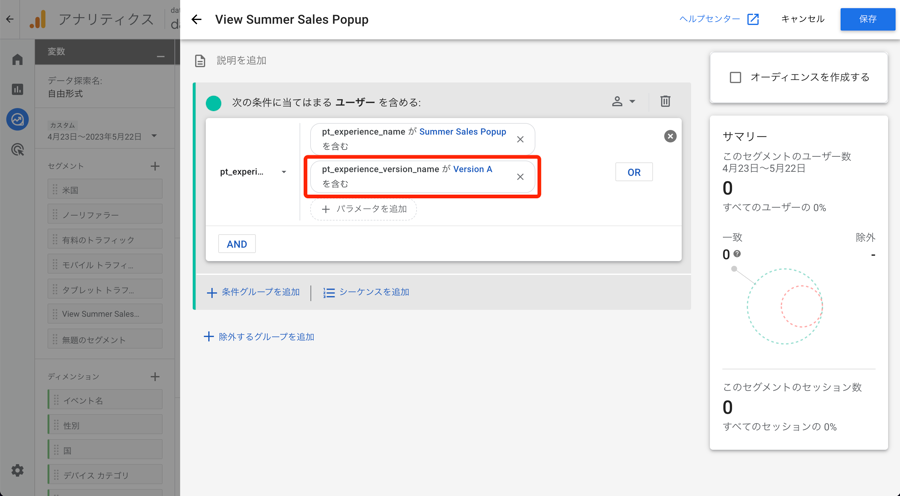 特定のバージョンを指定する場合は、再び「パラメータを追加」のドロップダウンリストをクリックして、別のパラメーターを追加し、pt_experience_version_nameをクリックし、このセグメントを作成する特定のバージョン名を選択または指定してください。