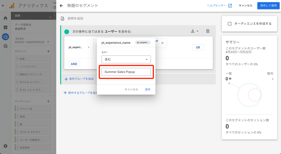 セグメントの名前を入力します。例えば、特定のエクスペリエンスやバージョン名です。