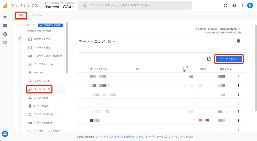 「管理」に移動し、「オーディエンス」を選択し、「オーディエンス」をクリックします。