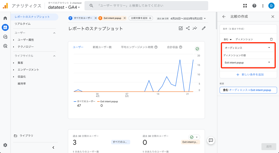 「オーディエンスの作成」画面で、「新しい条件を追加」のドロップダウンリストを展開し、「イベント」をクリックし、pt_experience_impressionまたはpt_experience_clickを選択します(作成するオーディエンスによって異なります)。 例えば、退出意図ポップアップを表示したユーザーのオーディエンスを作成する場合、イベントpt_experience_impressionを選択し、「パラメータを追加」をクリックしてpt_experience_nameを選択し、条件を「含む」に設定し、「体験名」と入力します。