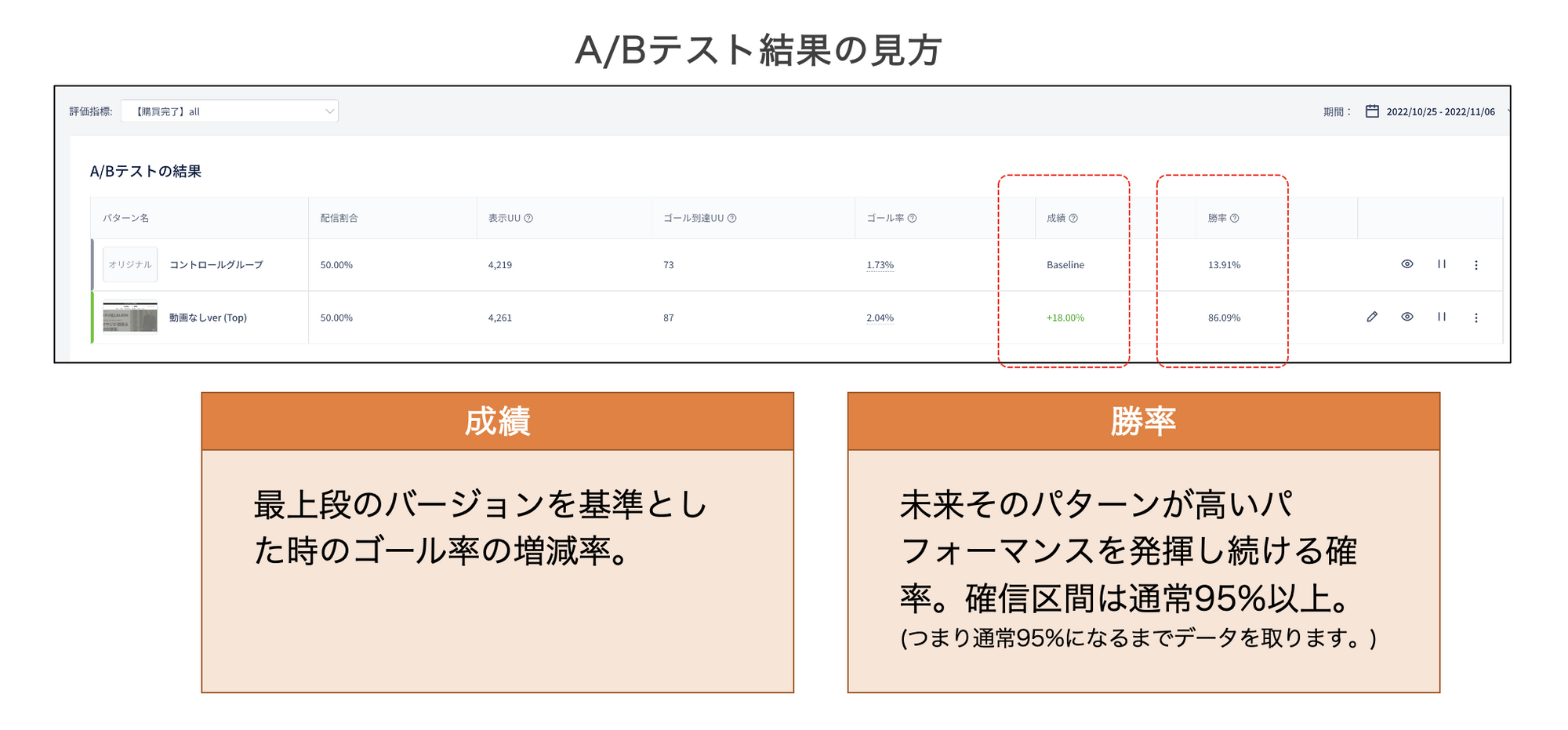 勝率とは、そのバージョンが他のバージョンに比べて優位であると判断できる確率です。