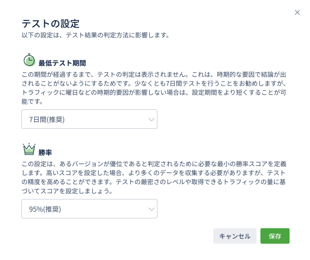 PtengineのA/Bテストの実施期間は「勝率」と「最低テスト期間」の閾値によって決まります。これにより、テストの精度と判定期間をコントロールできます。