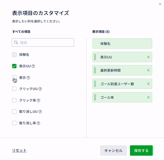 レポートリストに表示したい項目を右側のカラムに並べてください。