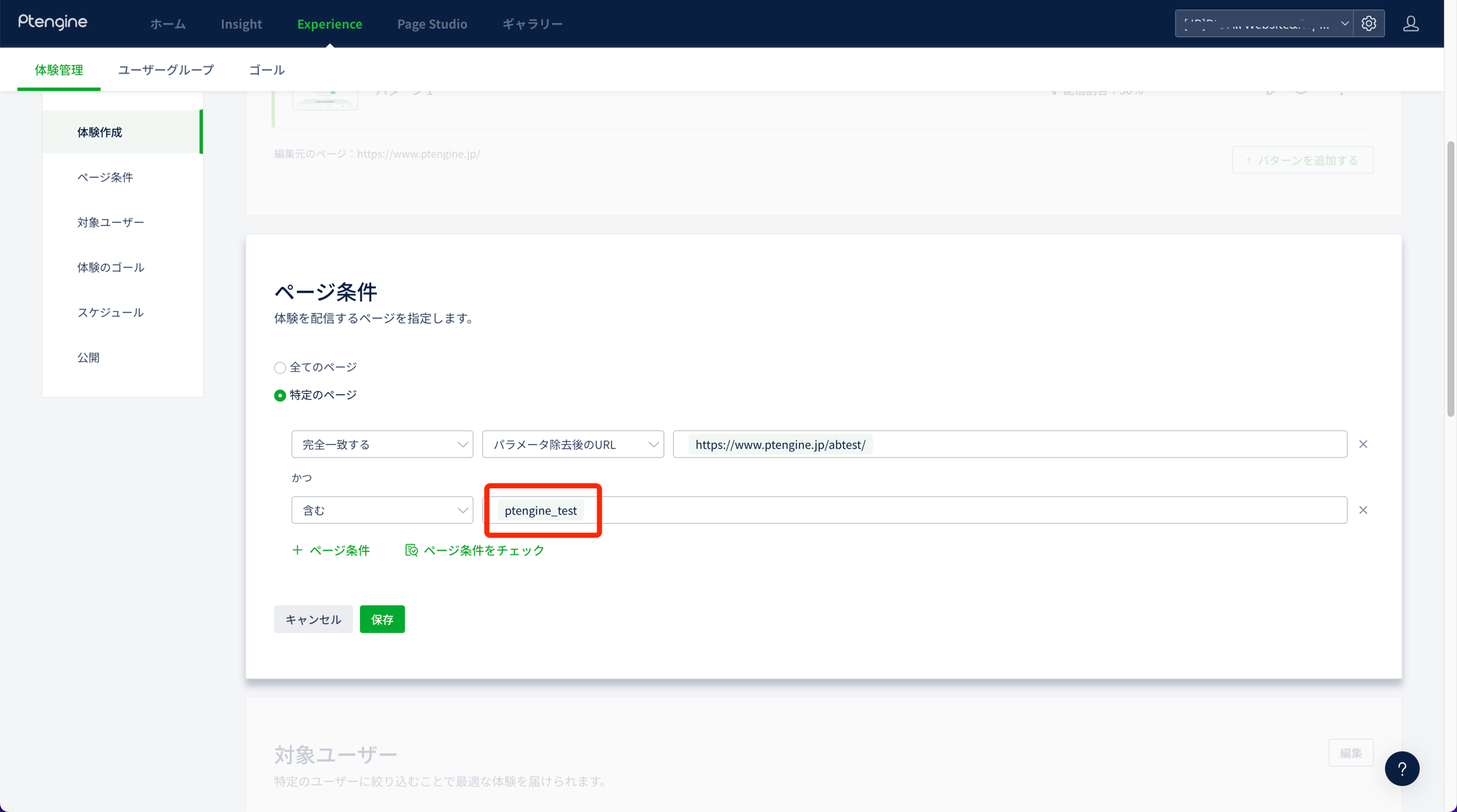 ページ条件にて、設定に内容にさらに条件を追加してください。 例:含む「ptengine_test」(テストパラメータ)
