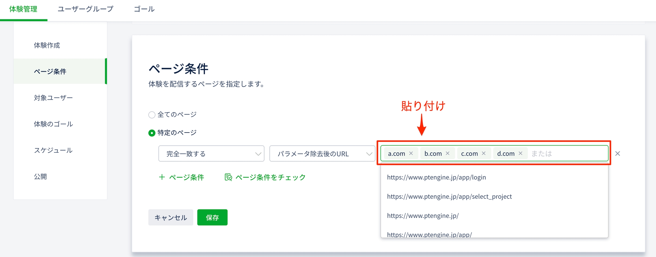 ページ条件または対象ユーザーの入力欄に貼り付ける