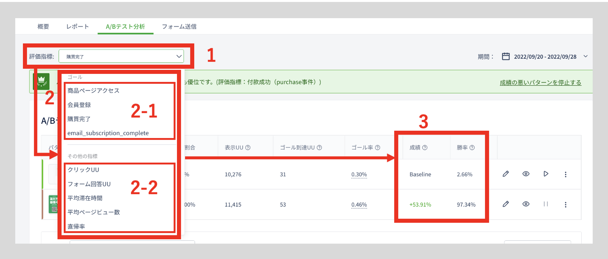 評価指標のリストがドリルダウンで表示されます 2-1:事前に体験に設定したゴールがここに表示されます。 2-2:デフォルトで利用できるゴール以外の指標です。