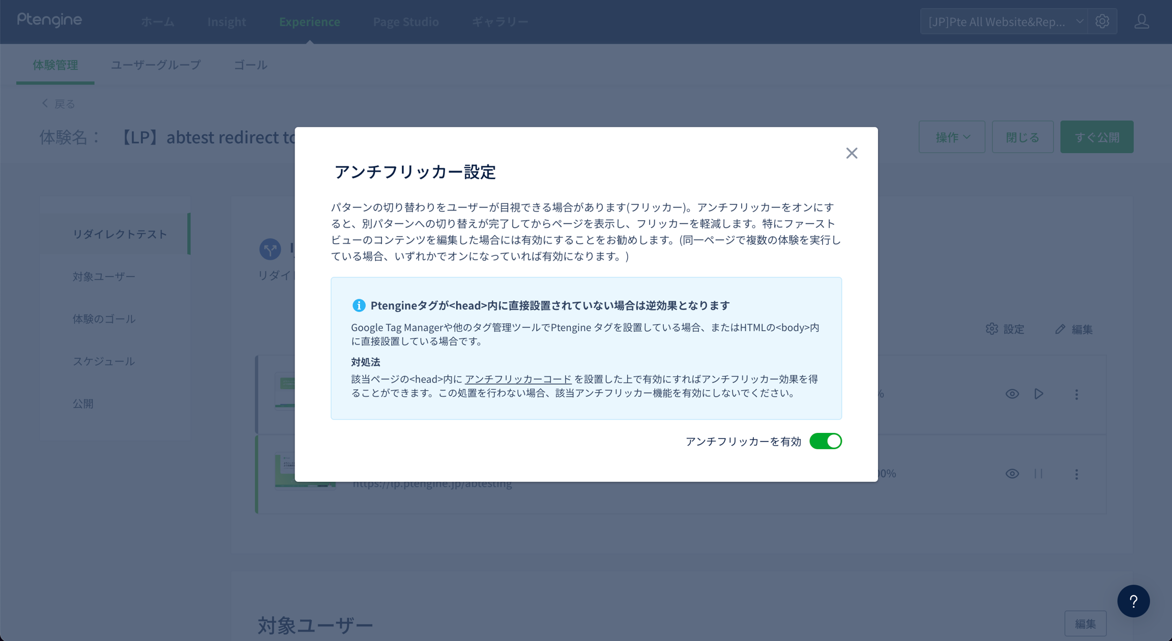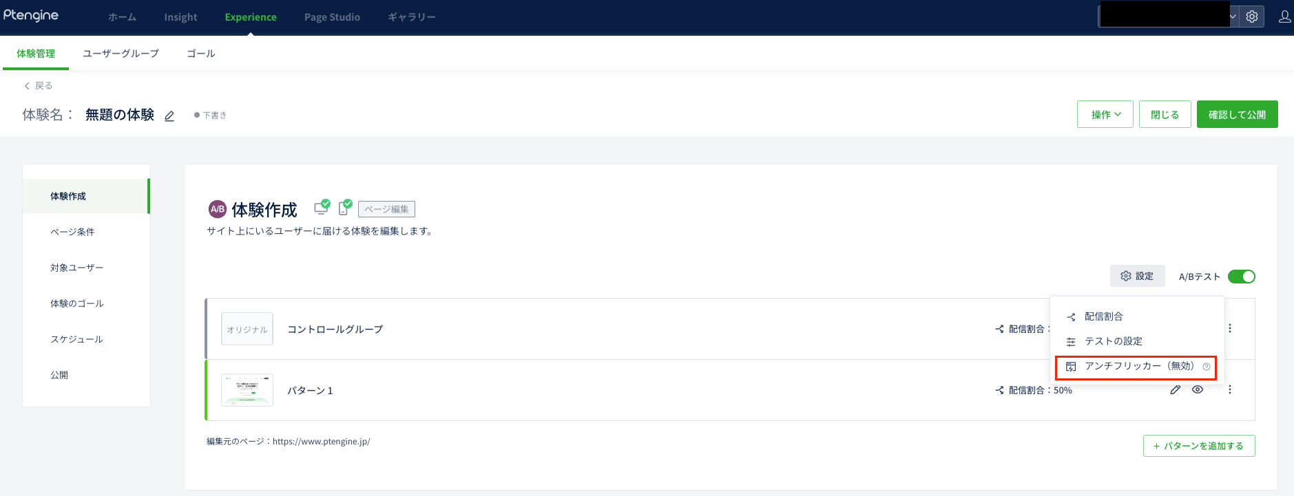 Ptengine experienceの体験の設定画面ではアンチフリッカー機能の「on/off」設定が可能です。