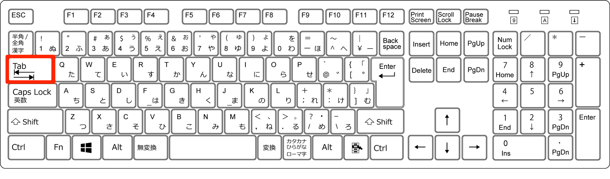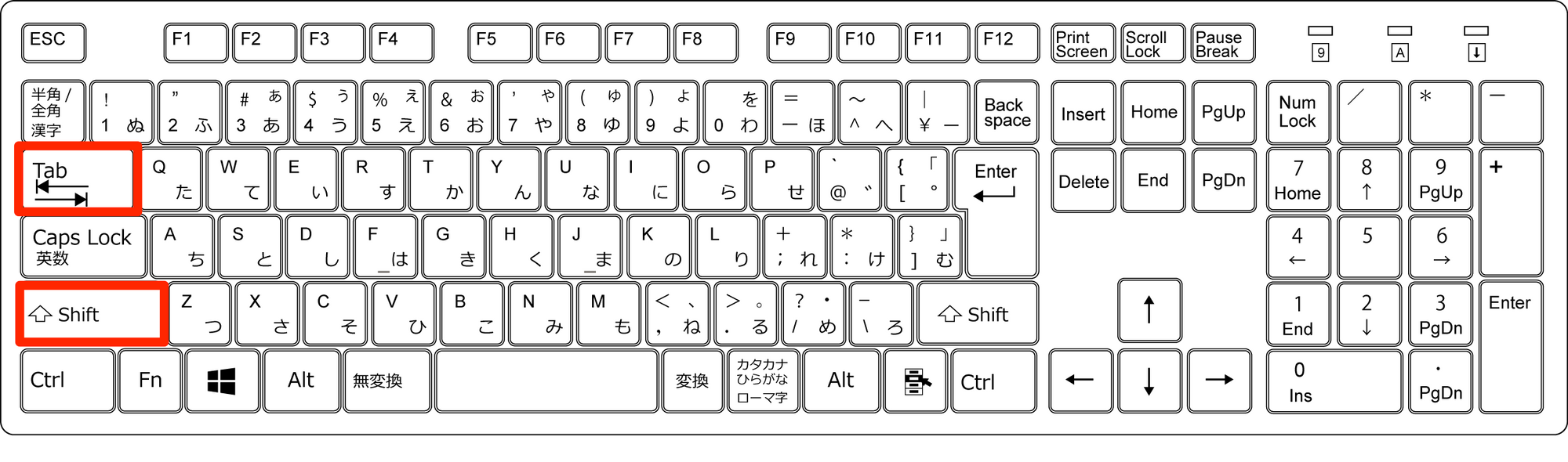 Shift + Tabキー:Tabキーで行なった操作を戻すことができます。