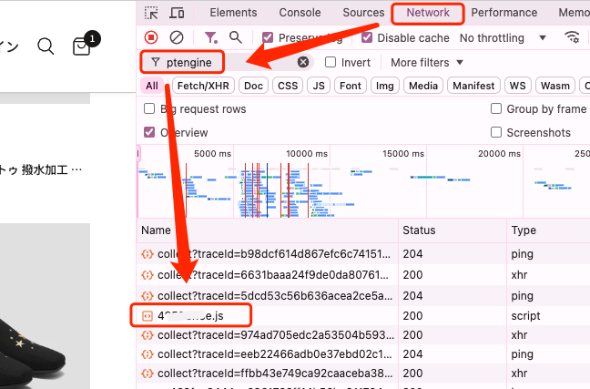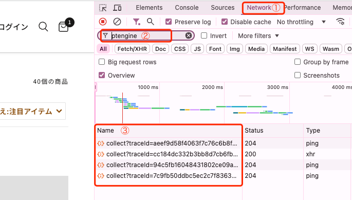 ptengine」と入力します。ページをスクロールしたりクリックしたりすると、「
