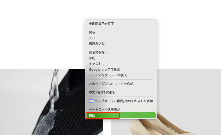 タグを設置したページにアクセスし、サイト上で右クリックして [検証] を選択し、ディベロッパーツールを起動します。