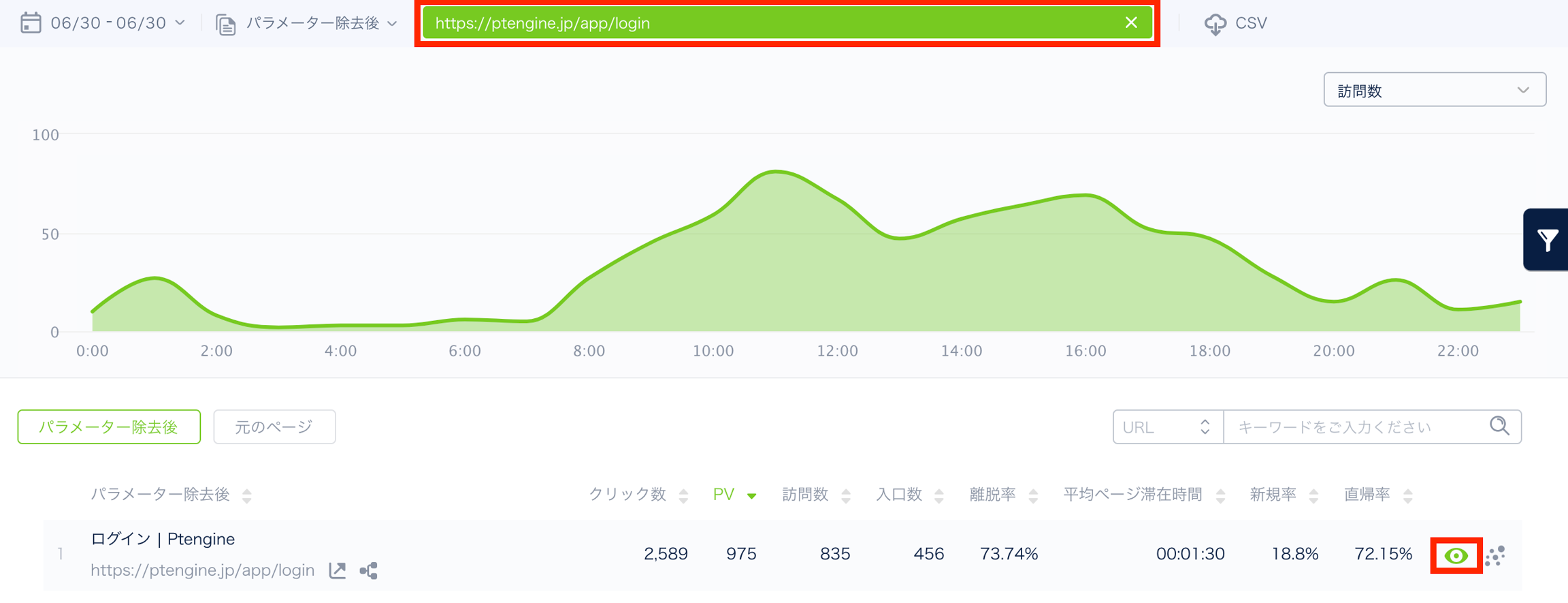 デフォルトは訪問数の高い順で表示されていますが、各指標名の箇所をクリックして、各データの降順・昇順で並び替えることができます。