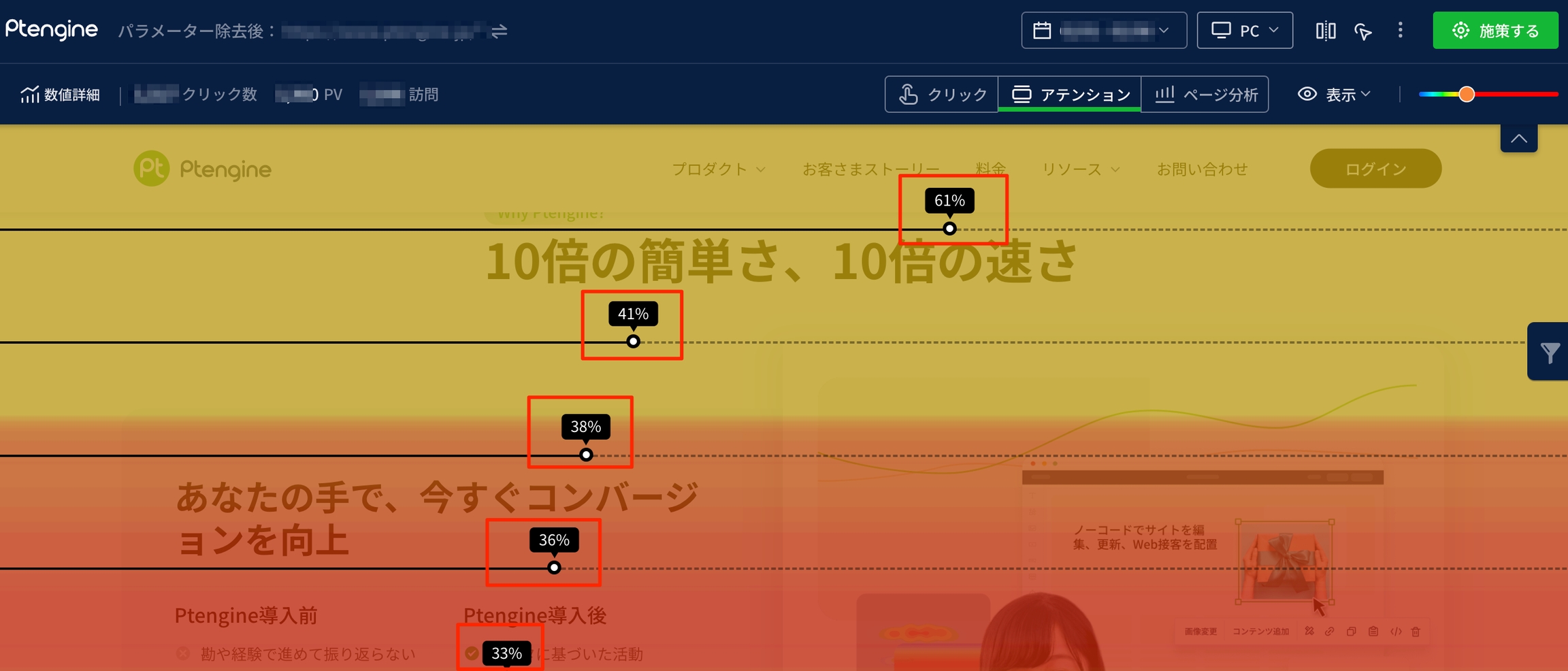 Ptengineは開発当初よりダイナミックヒートマップ技術を採用しており、静的にページを取得するのではなく、動的なページにも対応可能な高度な描画技術を駆使しています。これにより、訪問者のクリックやタップなどの閲覧行動を高精度に捉え、より深い顧客理解を実現します。
