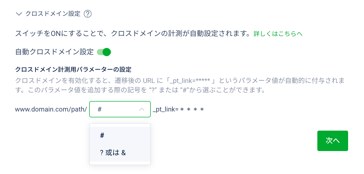 「クロスドメイン設定」のメニューを開いたら、スイッチをONにスライドします。「自動クロスドメインの設定が完了しました」と表示されたら設定完了です。必要に応じて、パラメータ識別子を選択ください(デフォルトでは # となります)。