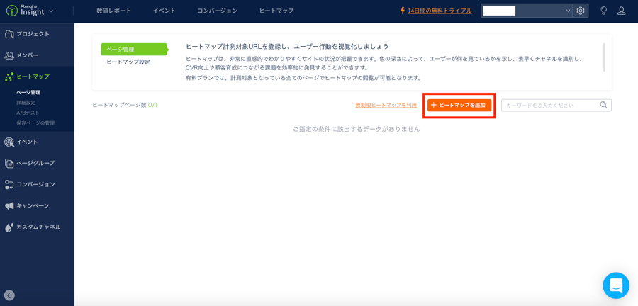 無料版では、設定画面で1つのURLを指定する必要があります。 最初にURLを登録する場合は、下記の画面で「ヒートマップを追加」をクリックしてください。