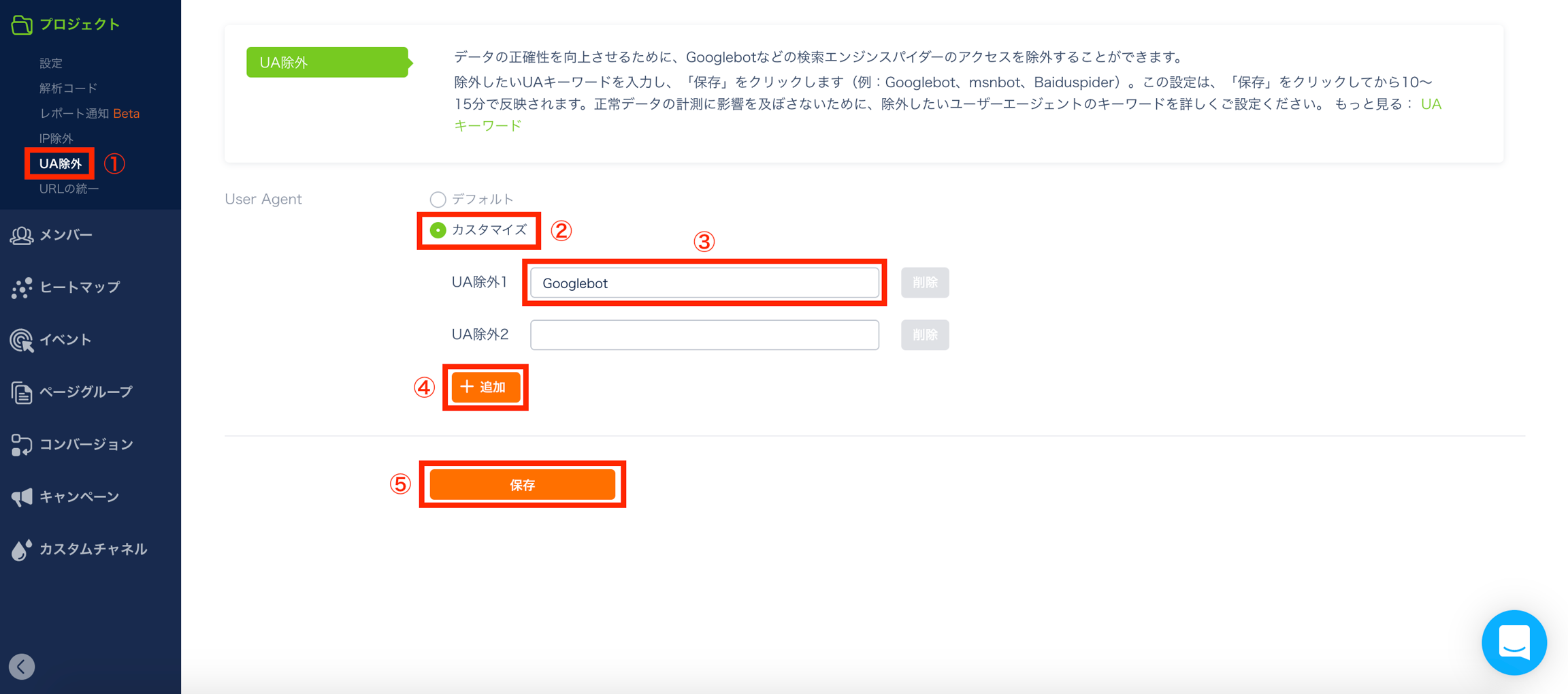 「基本設定」 > 「プロジェクト」 > 「UA除外」の順に進む