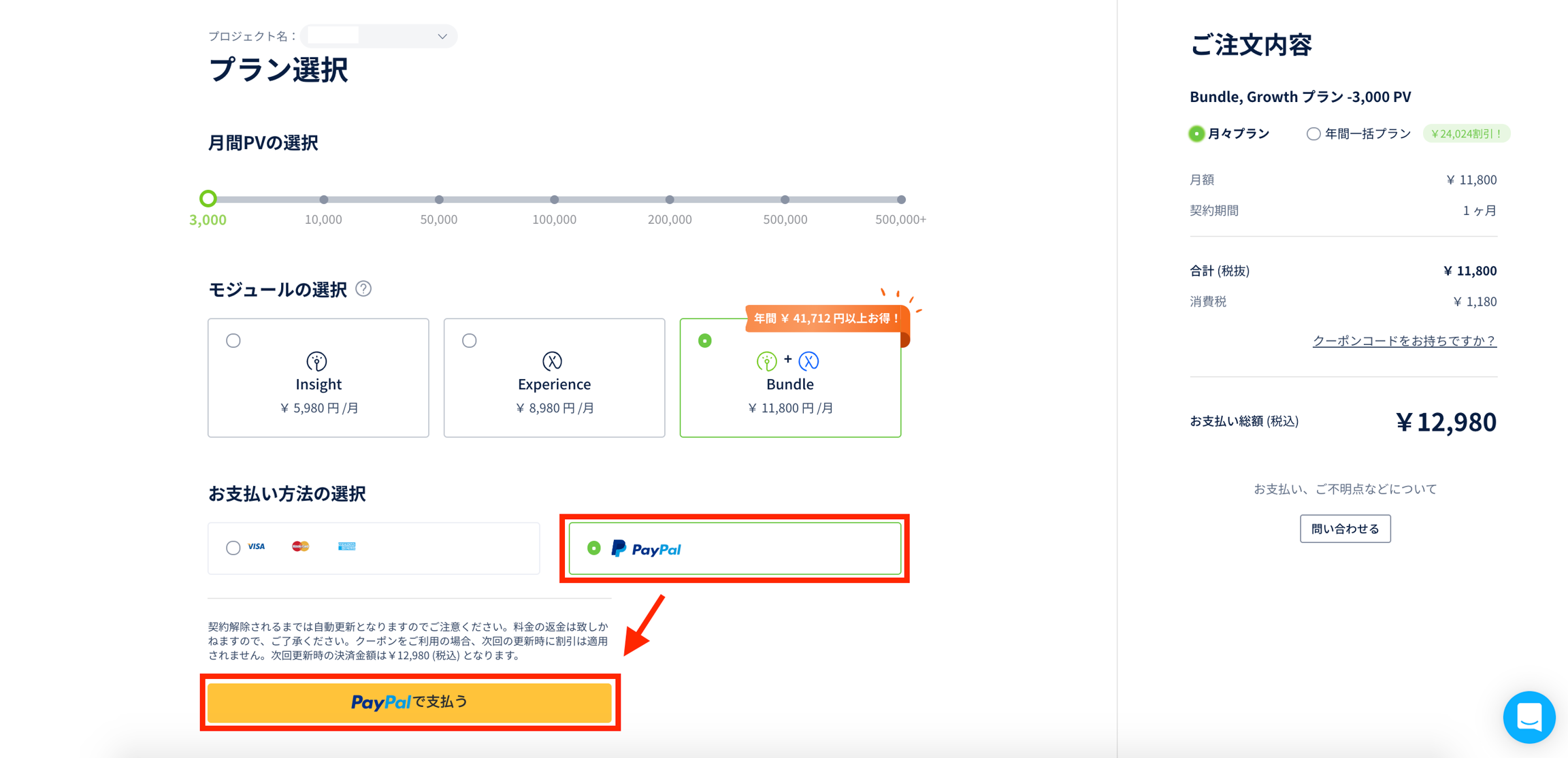お客様が選択したプラン料金や契約期間をご確認の上、問題がなければ「PayPalで支払う」をクリックしてください。