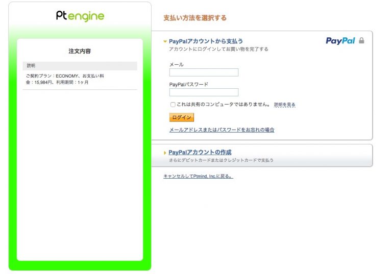 お客様が選択したプラン料金、契約期間について契約情報を画面の左側に確認することができます。契約内容をご確認の上、問題がなければ画面の右側にあるPayPalのログインフォームにお持ちのPayPal IDとパスワードを入力して、ログインして決済を行ってください。